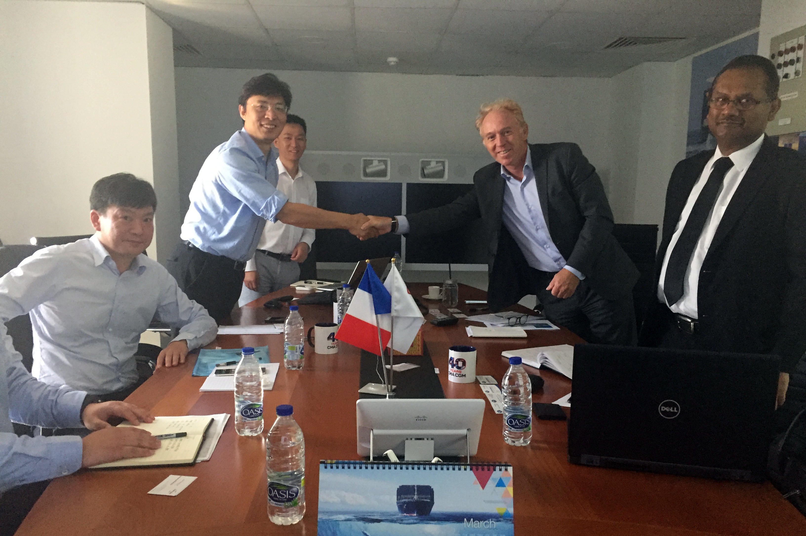 Mr. Courquin對(duì)馬聚勇一行的來(lái)訪表示熱烈歡迎,并介紹了達(dá)飛集團(tuán)及達(dá)飛海灣地區(qū)的發(fā)展情況。達(dá)飛海運(yùn)集團(tuán)(CMA CGM)總部設(shè)在法國(guó)馬賽,始建于1978年,是法國(guó)第一、世界第三的集裝箱承運(yùn)公司。Mr. Courquin希望通過(guò)此次會(huì)面,雙方可以增進(jìn)認(rèn)識(shí)、擴(kuò)大共識(shí)、建立互信,充分發(fā)揮雙方優(yōu)勢(shì),為開(kāi)展合作墊定堅(jiān)實(shí)基礎(chǔ)。