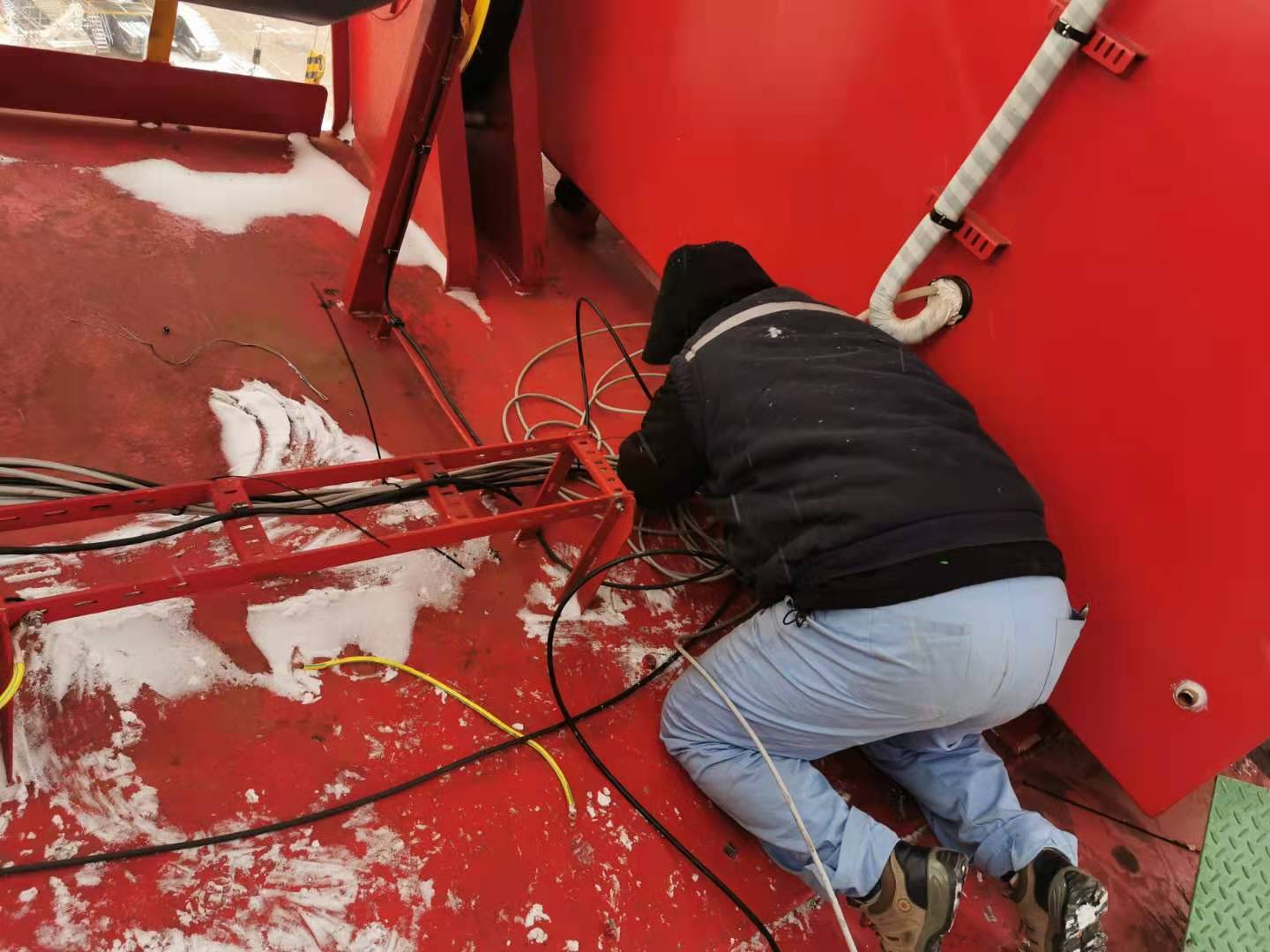 自2020年12月31日開始,為了追趕進度,我們團隊頂著冷風,放棄休息時間,把臂架到機房、司機室、電氣房的電纜敷設下來,進行捆扎。為了與船廠穿鋼絲錯開,吃飯的時間點總是往后推遲。甚至為了節(jié)省時間,自己提前帶好面包,中午簡單吃點,為的就是把工作搶一搶,看著已經(jīng)穿到位的電纜,不禁感嘆隊友們的拼勁兒。
