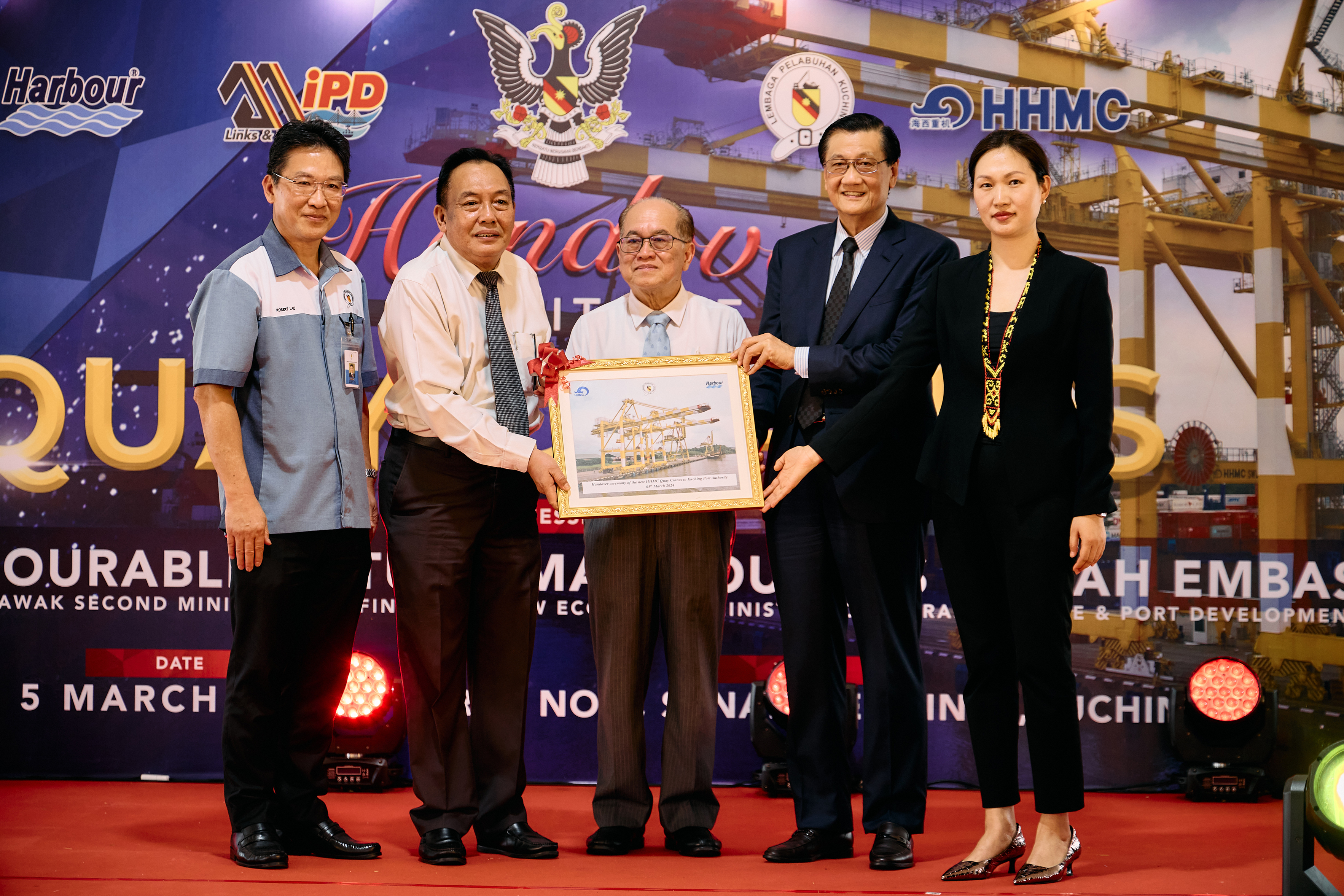 交機儀式上,馬來西亞砂拉越州副總理兼基礎建設與港口發(fā)展部部長Amar Douglas Uggah Embas、古晉港港務局主席Awang Bemee Bin Hj.Pengiran Ali Basah、Harbor Link集團董事長Francis Yong Piaw Soon蒞臨現(xiàn)場并分別致辭,各方強調了該項目對當?shù)馗劭诎l(fā)展的重要經(jīng)濟意義與社會意義,同時對海西重機產品以及項目團隊給予了充分肯定。隨后,各方在岸橋前進行剪彩并合影留念。