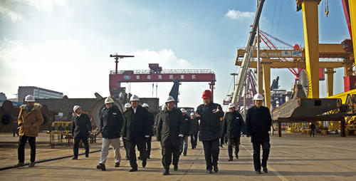 許克振一行實地考察了海西重機生產現(xiàn)場及組裝發(fā)運現(xiàn)場,參觀了包括韓國批量岸橋、自動化軌道吊等在內的港口機械設備及在制的批量自升式海工平臺項目,看望慰問了生產一線干部職工,并在隨后召開的中船重工青島海西灣基地相關企業(yè)負責人座談會上,聽取了海西重機董事長孫總關于企業(yè)產品結構、技術創(chuàng)新、生產經營及中長期發(fā)展規(guī)劃等方面的情況匯報。