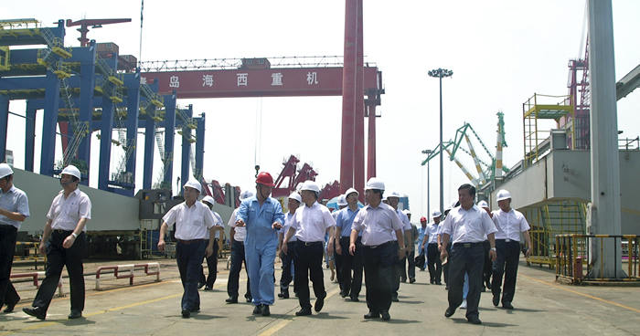 在海西重機總裝現(xiàn)場,張德平副市長實地考察了待批量發(fā)往黎巴嫩的岸橋和輪胎吊項目、發(fā)往馬來西亞的帶斗門機項目、發(fā)韓國鮮光新港的軌道吊項目及承制、調試的功能性海工平臺項目等。并聽取了海西重機董事長孫國慶關于企業(yè)上半年經濟運行情況、轉型升級取得的成績以及在目前經濟形勢下的合同承接情況。