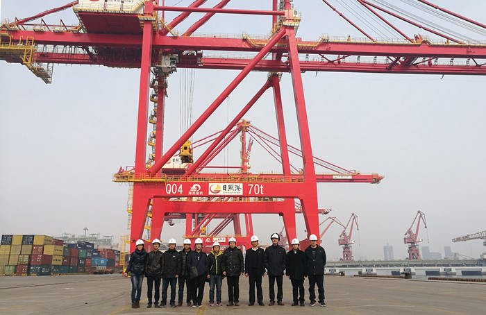 次日,在日照港客戶的大力支持下,考察團(tuán)隨同我司工作人員前往日照港,參觀考察了我司為其定制生產(chǎn)的大型岸橋、場(chǎng)橋、糧食碼頭門座起重機(jī)等設(shè)備,使考察團(tuán)對(duì)設(shè)備的現(xiàn)場(chǎng)使用情況有了更進(jìn)一步了解。