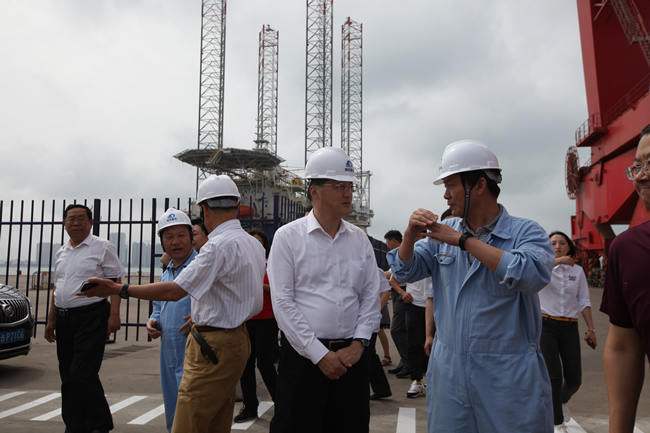 楊軍一行參觀了海西重機(jī)港口設(shè)備總裝現(xiàn)場,并重點(diǎn)參觀了在建的阿聯(lián)酋110米桁架自升式海工平臺,聽取了海西重機(jī)董事長鄧振山對公司目前生產(chǎn)經(jīng)營形勢、生產(chǎn)負(fù)荷情況等方面的介紹,對海西重機(jī)在國際海工平臺市場上所取得的成績給予了肯定。