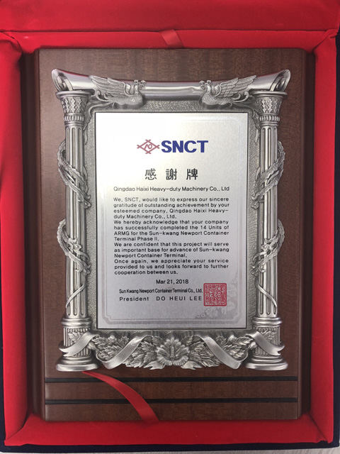 近日,海西重機收到來自韓國仁川新港鮮光新港集裝箱碼頭(SNCT)總裁李道熙代表SNCT授予的“感謝牌”,對海西重機在2017年和2018年兩個自動化項目中的優(yōu)秀表現(xiàn)給予高度認可,對海西所交付設(shè)備在碼頭發(fā)展中起到的重要作用表示感謝。