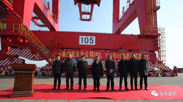 交接暨列編儀式在上港集團(tuán)宜東集裝箱碼頭分公司黨委書記陳波宣布105岸橋正式啟用和2臺65噸岸橋完成抓箱等一系列順暢操作中圓滿結(jié)束。