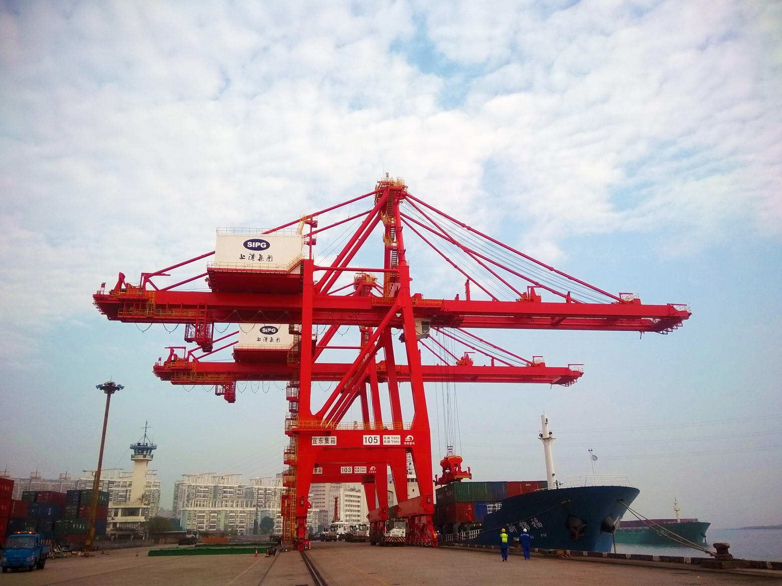 12月13日早5時,G215項(xiàng)目的2臺舊機(jī)岸橋如期發(fā)運(yùn),上海的天氣也終于放晴,雨后的太陽總是那么的耀眼。經(jīng)過雨水的洗禮,屹立在黃浦江邊的2臺新機(jī)岸橋在藍(lán)天白云的映襯下也顯得格外耀眼,那一抹鮮紅已然成為黃浦江風(fēng)景的一部分,那一抹鮮紅也成為了海西重機(jī)走進(jìn)上海港的名片。
