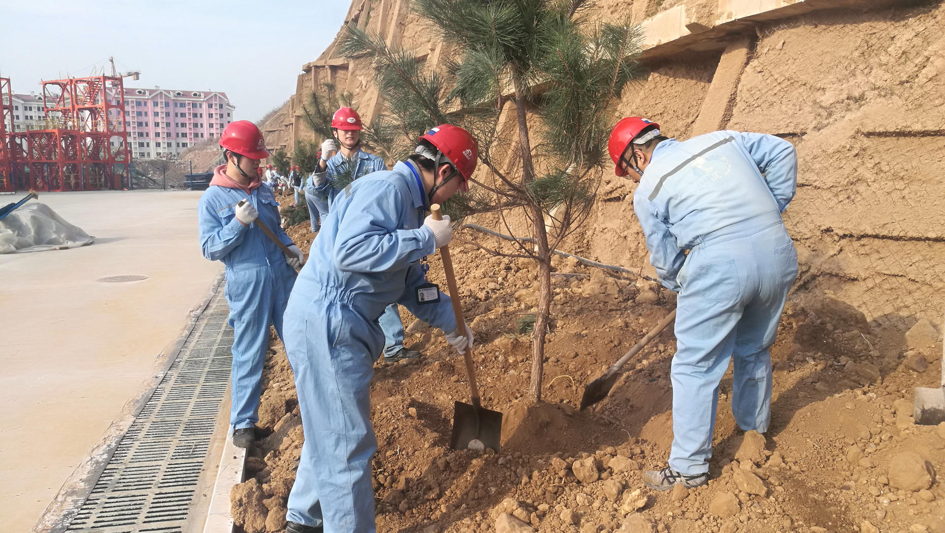 瘠地力挖苗培入,荒坡手植樹皆嘉。三倆人,一棵樹。在廠區(qū)的新建護(hù)坡下,大家熱火朝天的忙著,紛紛揮鍬鏟土,定點(diǎn)挖坑,放苗回填,你扶我植,好不熱鬧。在春天植入希望,我們栽種的不僅是常青樹,更是快樂和責(zé)任。