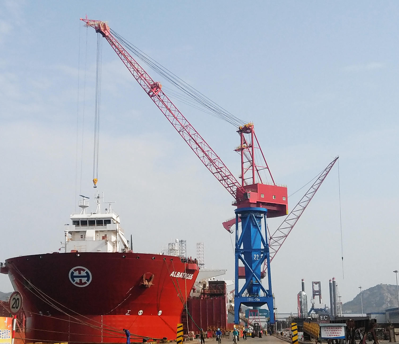 該門機(jī)自重約1200噸,門架結(jié)構(gòu)為雙層八撐桿形式,回轉(zhuǎn)支承裝置為轉(zhuǎn)柱式,變幅形式為單臂架鋼絲繩變幅,主鉤起重量為120噸,最高起升高度108米,變幅幅度為23米-70米,主要用于船舶洗滌塔改造。