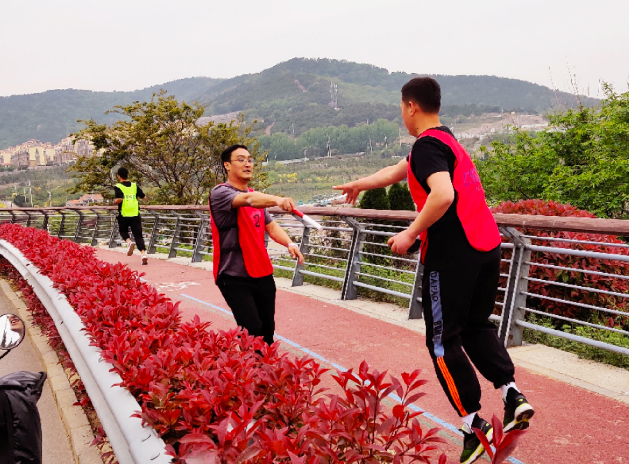 上午八點四十分,參賽選手早早來到起點熱身區(qū),第二、三、四棒運(yùn)動員也前往接力區(qū)就位。大家服裝整齊、精神飽滿、神采奕奕,一起做著跑前熱身運(yùn)動,防止肌肉拉傷。選手們紛紛“摩拳擦掌”,準(zhǔn)備來一場“速度與激情”的比拼。場邊觀戰(zhàn)的加油團(tuán),也在為自己支持的隊伍鼓勁兒:“加油!我們得贏在起跑線,來個開門紅!”九點鐘,隨著一聲發(fā)令槍響,第一棒的選手們迅速進(jìn)入狀態(tài),以飽滿的熱情、昂揚(yáng)的斗志,從起跑線飛奔而出。五月的東環(huán)島路氣候宜人,郁郁蔥蔥,參賽選手們奮力奔跑的身影為水秀山明的畫卷平添了一抹靈動色彩。