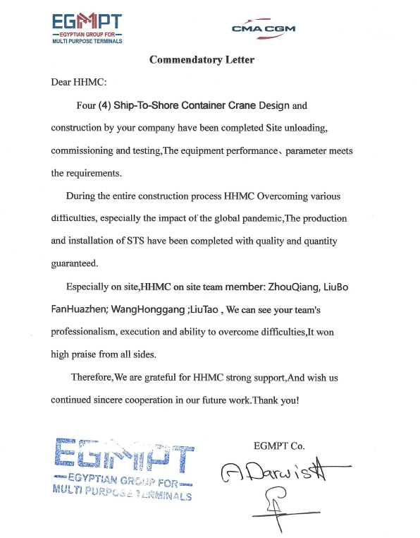 亞歷山大港多用途碼頭為埃及國家重點項目,埃及國家領(lǐng)導人員高度關(guān)注該項目進展。岸橋到達用戶碼頭后,項目組嚴格按照策劃節(jié)點穩(wěn)步推進每天工作,確保當日事當日畢,最終在整個項目組通力協(xié)作以及用戶的積極配合支持下,岸橋順利完成交付,并按計劃進入保產(chǎn)。期間,埃及總理、交通部部長對海西重機產(chǎn)品及現(xiàn)場項目團隊給予了充分肯定,多家當?shù)孛襟w對此進行了專題報道。用戶特地向我司發(fā)來一封表揚信以示感謝。