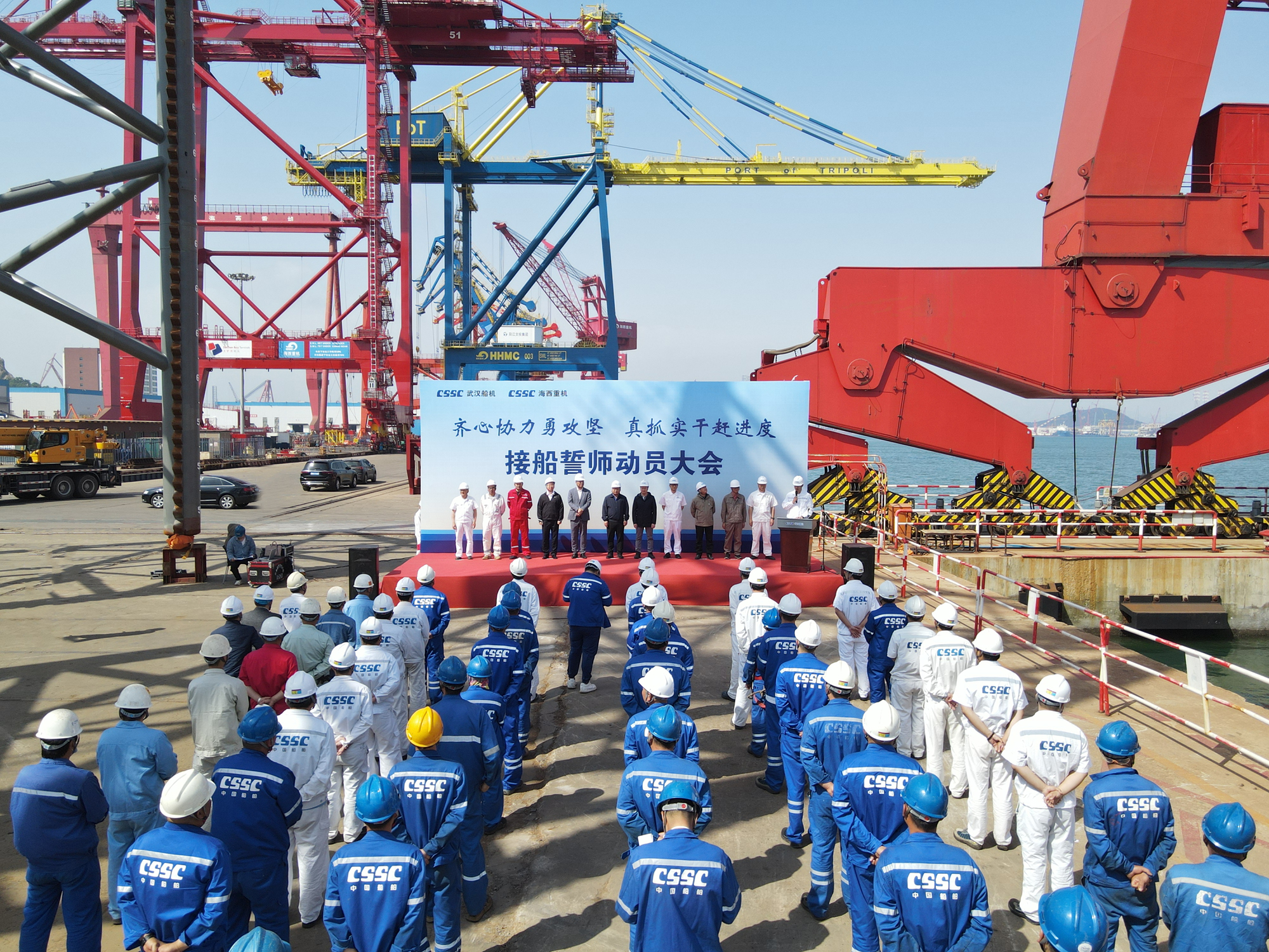 為了明確目標(biāo)、凝聚共識、齊心協(xié)力、克難攻堅(jiān),亮明迎難而上的堅(jiān)定信心和堅(jiān)強(qiáng)決心,動(dòng)員全員上下持續(xù)營造濃厚干事氛圍,掀起“齊心協(xié)力勇攻堅(jiān),真抓實(shí)干趕進(jìn)度”的高潮,全力以赴打好海工項(xiàng)目集中攻堅(jiān)戰(zhàn),5月25日上午,中國船舶集團(tuán)旗下武漢船機(jī)海西重機(jī)公司在生產(chǎn)現(xiàn)場組織開展接船誓師動(dòng)員大會(huì)。華夏金融租賃有限公司、北京神大集團(tuán)有限公司、飛勵(lì)特船舶管理有限公司、大津重工泰州分公司、江陰雙馬重工裝備有限公司、武漢船機(jī)海西重機(jī)等相關(guān)方參加本次動(dòng)員大會(huì)。