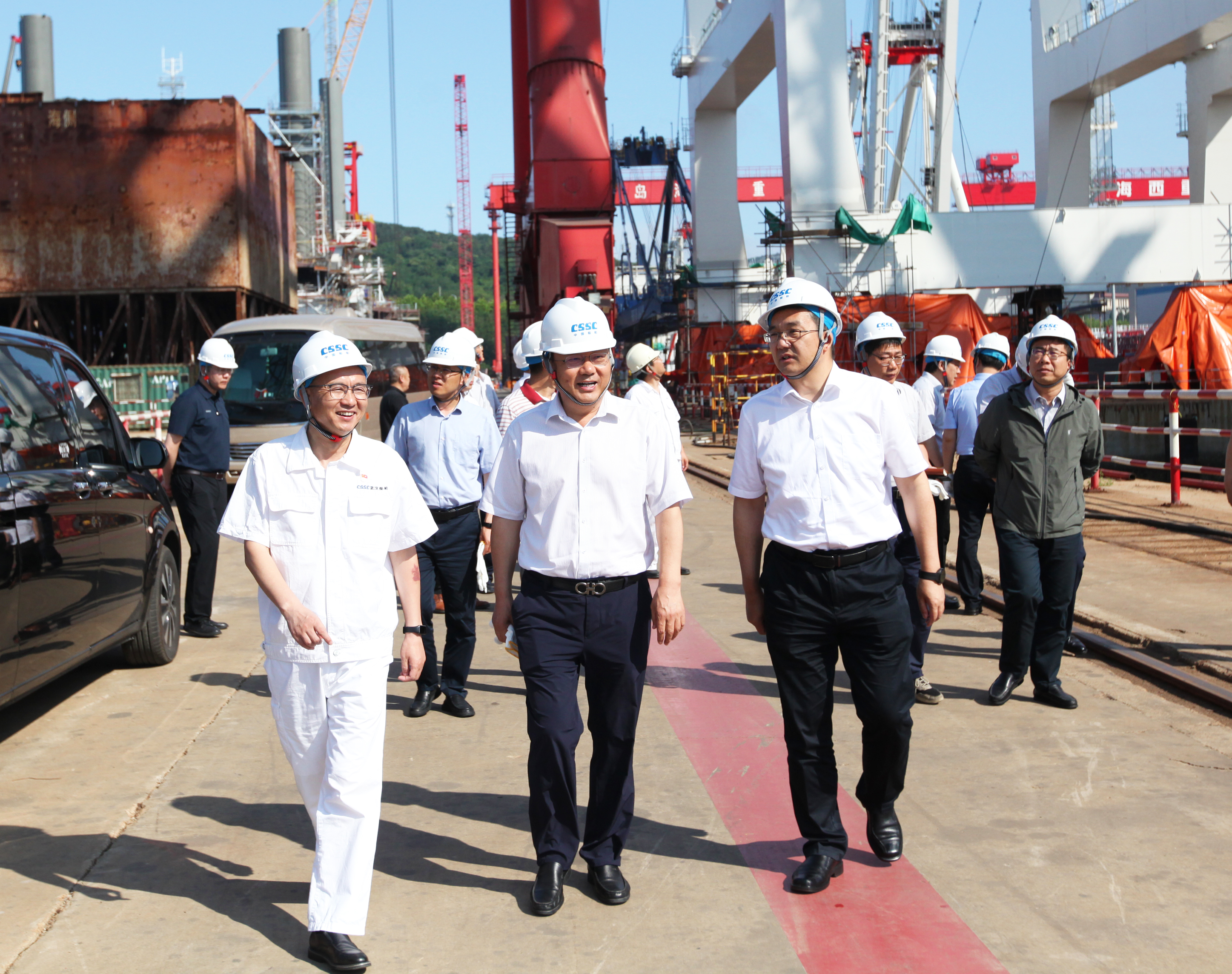 6月17日,天津港(集團(tuán))有限公司黨委副書(shū)記、總裁焦廣軍一行到中國(guó)船舶武漢船機(jī)旗下海西重機(jī)公司考察調(diào)研,武漢船機(jī)黨委副書(shū)記、總經(jīng)理程立兵參加調(diào)研。