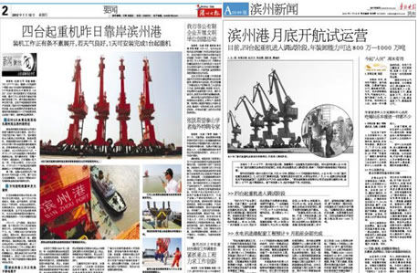 我公司為濱州港務(wù)有限責(zé)任公司承制的4臺MQ2533門座起重機(jī)于2012年7月10日運(yùn)抵濱州港碼頭后,引起了當(dāng)?shù)卣鐦O大關(guān)注。濱州市委書記、濱州市長辦公室、濱州市委組織部、濱州市海事局、濱州市公安局、以及各縣區(qū)級領(lǐng)導(dǎo),先后到碼頭進(jìn)行參觀指導(dǎo),濱州日報(bào)、魯北晚報(bào)更是多次到碼頭進(jìn)行采訪報(bào)道。