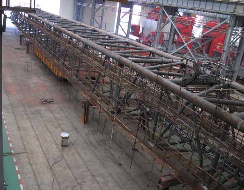 500T全回轉(zhuǎn)固定吊臂架長110米,寬6.5米,高5米,重達(dá)200余噸。自接到生產(chǎn)任務(wù)以來,針對該項(xiàng)目生產(chǎn)任務(wù)緊、制作周期短、難度大等特性,鋼構(gòu)部統(tǒng)籌部署,多管齊下,確保項(xiàng)目進(jìn)展。首先以節(jié)點(diǎn)實(shí)現(xiàn)率為重點(diǎn),細(xì)化施工隊(duì)、焊工隊(duì)節(jié)點(diǎn)考核,嚴(yán)格執(zhí)行;其次考慮技術(shù)熟練程度和連續(xù)性,所有施工及管理人員均采用3600T浮吊臂架原班人馬,各工種24小時(shí)不間斷作業(yè),全力推進(jìn)項(xiàng)目進(jìn)展;第三各負(fù)責(zé)調(diào)度、檢驗(yàn)人員、工藝人員等各司其職、齊心協(xié)力,監(jiān)管措施到位,工序銜接順暢,確保臂架各分支計(jì)劃穩(wěn)步推進(jìn)。在各項(xiàng)有效措施的保障下,在工藝部和品質(zhì)部的全力配合下,該臂架制作歷時(shí)不到40天,制作周期較同類型吊臂架縮短了一倍以上,且一次探傷合格率達(dá)98.5%,結(jié)構(gòu)質(zhì)量和外觀成型得到了業(yè)主的一致認(rèn)可和表揚(yáng),創(chuàng)造了鋼構(gòu)部制作行架結(jié)構(gòu)件的奇跡!