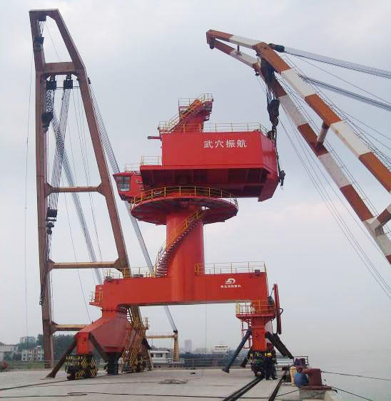 日前,裝載青島海西重機兩臺門座起重機的船舶靠泊武穴振航件雜貨碼頭,經過現場工作人員的共同努力,兩臺門機順利吊裝完成,屹立于武穴振航碼頭上,成為長江邊上一道亮麗的風景線。